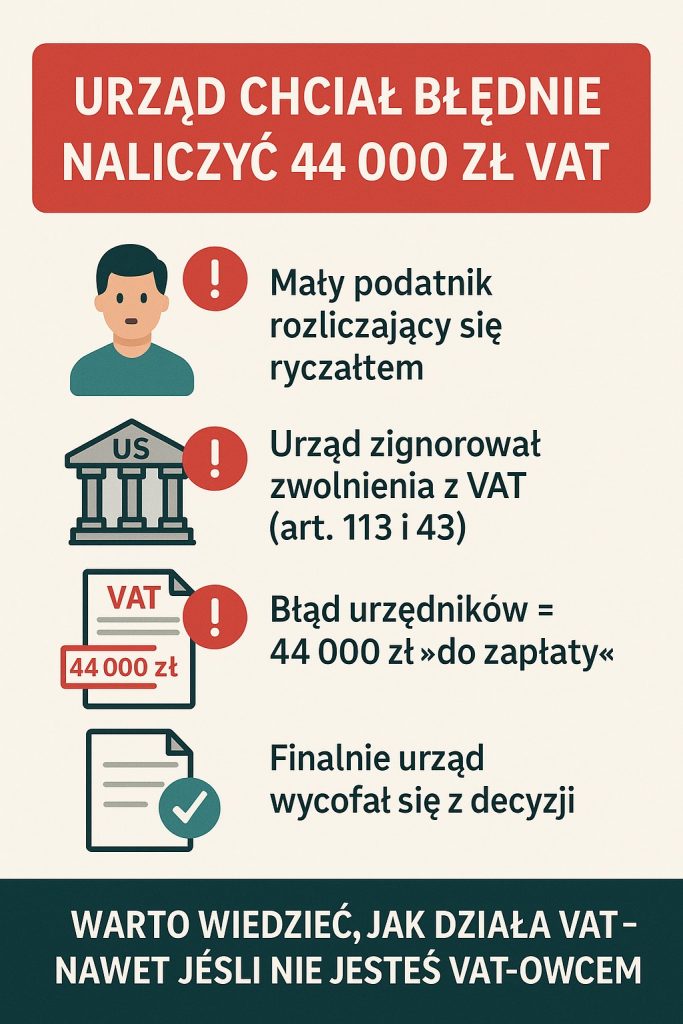 Urząd skarbowy, bez głębszej analizy, wezwał go do rejestracji w VAT, uznając, że przekroczył próg 200 000 zł obrotu. Co więcej – w toku kontroli naliczono mu aż 44 000 zł zaległego VAT-u!